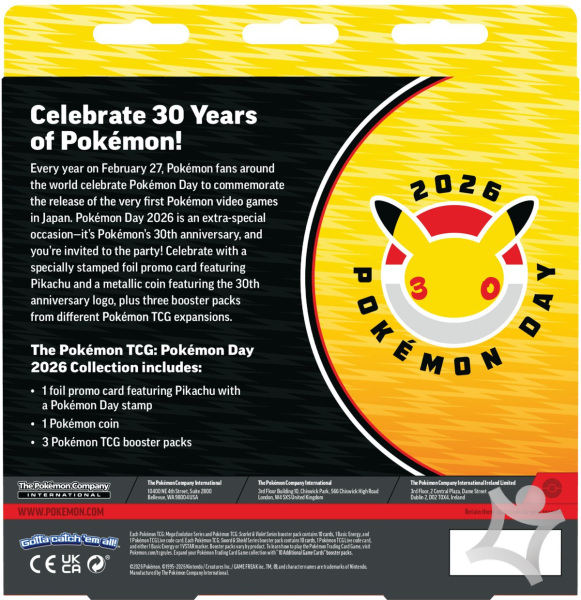 Zberateľská kolekcia Pokémon TCG: Pokémon Day 2026 Collection oslavuje výnimočné 30. výročie sveta Pokémonov. Obsahuje ikonickú promo kartu Pikachu so špeciálnou pečiatkou Pokémon Day 2026, tri booster balíčky z najnovších expanzií a exkluzívnu metalickú mincu s logom 30 rokov. Jedná sa o jedinečnú príležitosť získať pamätné predmety, ktoré sa do predaja už nevrátia. Kolekcia Pokémon TCG: Pokémon Day 2026 Collection je určená pre nových hráčov aj skúsených zberateľov.