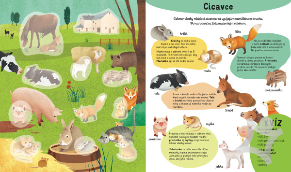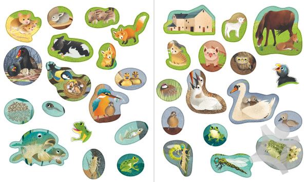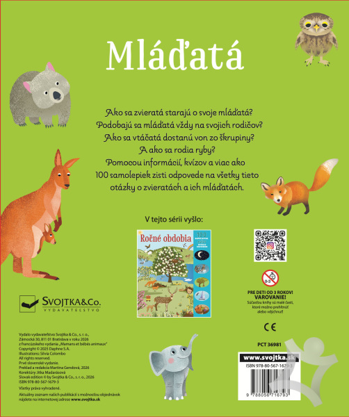 Kniha so samolepkami nabitá informáciami o mláďatách rozšíri obzory nejednému malému nadšenému prírodovedcovi. Každá dvojstrana obsahuje celostránkovú ilustráciu, kam sa lepia samolepky, ďalej plno informácií o cicavcoch, vtákoch, vačkovcoch, hmyze, zvieratách v polárnych oblastiach a mnoho ďalšieho. Nasleduje kvíz na zopakovanie si nových poznatkov. Prepracované obrázky, zaujímavosti zo sveta zvierat, kvízy a 100 samolepiek na nalepenie do obrázkov, to všetko ponúka táto knižka, ktorá je dôkazom toho, že aj učenie môže byť zábavné.