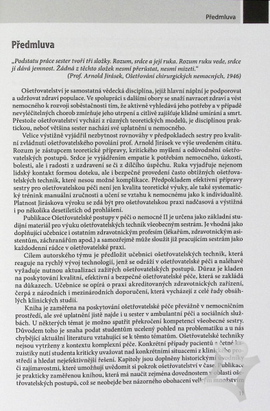 Moderní učebnice ošetřovatelských postupů pro studenty oboru ošetřovatelství a všeobecného lékařství je koncipována podle stěžejních požadavků předmětu ošetřovatelství. Po jejím prostudování získají studenti všechny potřebné znalosti a informace, které jim tak pomohou úspěšně absolvovat tento předmět. Druhý díl zpracovává problematiku péče o nemocné se zaměřením na následující okruhy: sledování fyziologických funkcí, péče o dýchací cesty a dýchání, vyprazdňování a inkontinence, ošetřování nemocného se stomií, enterální výživa, odběry biologického materiálu a péče o umírajícího člověka a péče o tělo zemřelého. Problematika je předkládána srozumitelnou, názornou a poutavou formou - kapitoly jsou doplněny bohatým obrazovým materiálem, kazuistikami, zajímavostmi i odkazy na další literaturu.