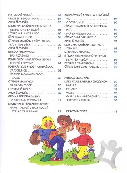 Kniha skúsených autoriek Marie Tetourovej a Edity Plickovej pomôže všetkým začínajúcim školákom. Potešenie a zábavu nájdu napríklad v komiksovom seriáli Dom u piatich škriatkov a s pravidlami slušného správania sa zoznámia v kapitole Ahoj, človiečik. Nechýbajú básničky, veršované príbehy, rozprávky alebo povesti, s ktorými si deti precvičia pamäť a obohatia slovnú zásobu. Veľmi obľúbené je aj maľované čítanie. Stránky pre prváka obsahujú matematické úlohy, doplňovačky, porovnávanie obrázkov, rébusy či hádanky, ktoré rozvíjajú pozornosť, sústredenie a logické myslenie. Knihu dopĺňa prehľadný atlas základných rastlín a živočíchov.