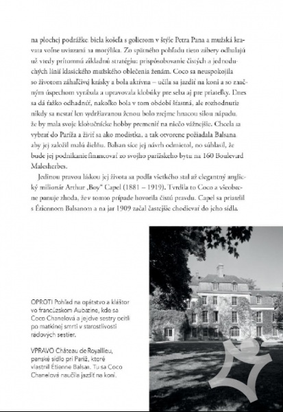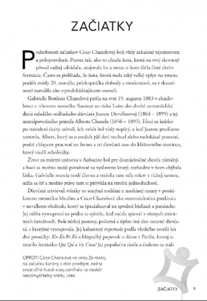 Kniha oslavuje život a dielo tejto neobyčajne vplyvnej návrhárky a sleduje jej cestu za úspechom zo skromných pomerov až po globálny fenomén značky, ktorá svoje pole pôsobnosti rozšírila aj o parfumy, šperky a doplnky. Dokonca aj dnes, štyridsať rokov po smrti, zostáva Coco neodmysliteľným symbolom módneho domu Chanel.