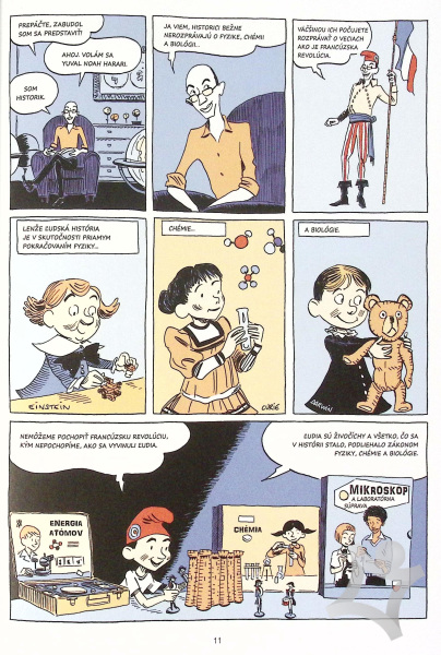 Na ceste dejinami sprevádzajú čitateľa nezabudnuteľné postavy: praveký Bill, doktorka Fiktívna, detektívka Lopezová a samotný Harari v roli sprievodcu. Každá téma dostáva vlastný vizuálny jazyk - humor, satira a vedecká presnosť sa tu prekvapivo dobre dopĺňajú. Harari na tejto adaptácii úzko spolupracoval s belgickým scenáristom David Vandermeulenom a francúzskym ilustrátorom Daniel Casanavem, ktorí sú uznávanými osobnosťami európskeho komiksu.
