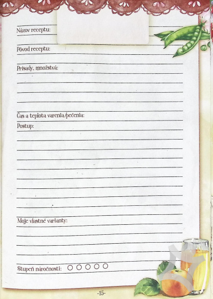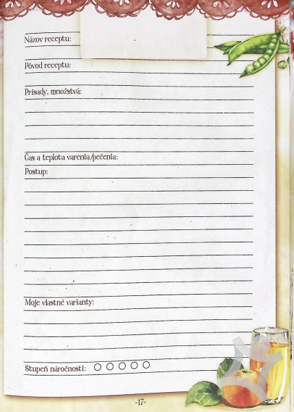 Obsahuje oboje - niekoľko predtlačených receptov ako inšpirácia, no ťažisko knihy tvorí zápisníková časť, kam si môžete zapisovať vlastné recepty a poznámky.
