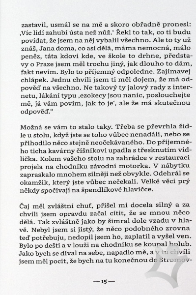A že kdo se s minulostí nevyrovnal, nemá ani budoucnost. Teprve po čase mi došlo, že mě celou dobu učil, jak používat svoji mysl. Do té doby jsem nevěděl, jak se to dělá, a že je možné považovat svoje myšlenky za pevný most, a ne za jeho zrcadlový obraz. Naučil mě, jak nebýt kořistí ani lovcem, ale vědomým člověkem žijícím šťastně v magické realitě proměnlivého života.