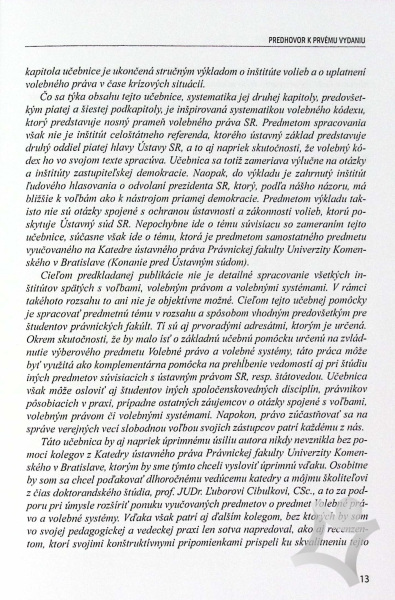 Cieľom druhého vydania publikácie je, rovnako ako v prípade prvého, systematické spracovanie problematiky volebného práva SR, ako aj základných otázok volieb, volebného práva a volebných systémov vo všeobecnosti. Predkladaná publikácia je primárne určená ako učebnica pre rovnomenný výberový predmet, ktorý je vyučovaný na Právnickej fakulte Univerzity Komenského v Bratislave. Môže však poslúžiť aj ako komplementárna pomôcka na prehĺbenie vedomostí pre študentov iných spoločenskovedných disciplín, právnikov pôsobiacich v praxi či ostatných záujemcov o otázky spojené s voľbami, volebným právom či volebnými systémami. Druhá časť publikácie, najmä jej šiesta kapitola, môže slúžiť aj ako praktická pomôcka pre voliča na lepšie pochopenie pravidiel jednotlivých druhov volieb, s ktorými sa v SR stretávame.