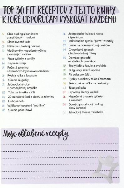 - Inšpiruje Ťa na každý deň: Už žiadne otázky typu “Čo mám zase variť?”. Kniha je plná praktických fit receptov na raňajky, desiate, obedy, večere, polievky, šaláty, cestoviny, nápoje či dezerty.