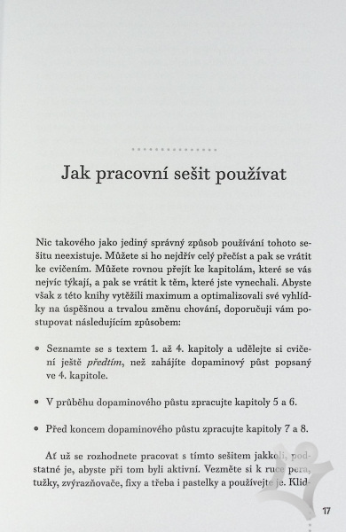 Průvodce je určen každému, kdo se rozhodne změnit způsoby, jimiž se odměňuje. Pomůže vám lépe se zorientovat v problematice patologického potěšení a bolesti. Díky množství interaktivních cvičení a inspirativních příkladů budete schopni přesněji určit návykové látky a způsoby chování, o jejichž omezení či změně uvažujete. Získáte návod, jak si naplánovat, zahájit a úspěšně dokončit dopaminový půst, dopracovat se k přenastavení drah odměny v mozku a v konečném důsledku vést zdravější, spokojenější a plnohodnotnější život.